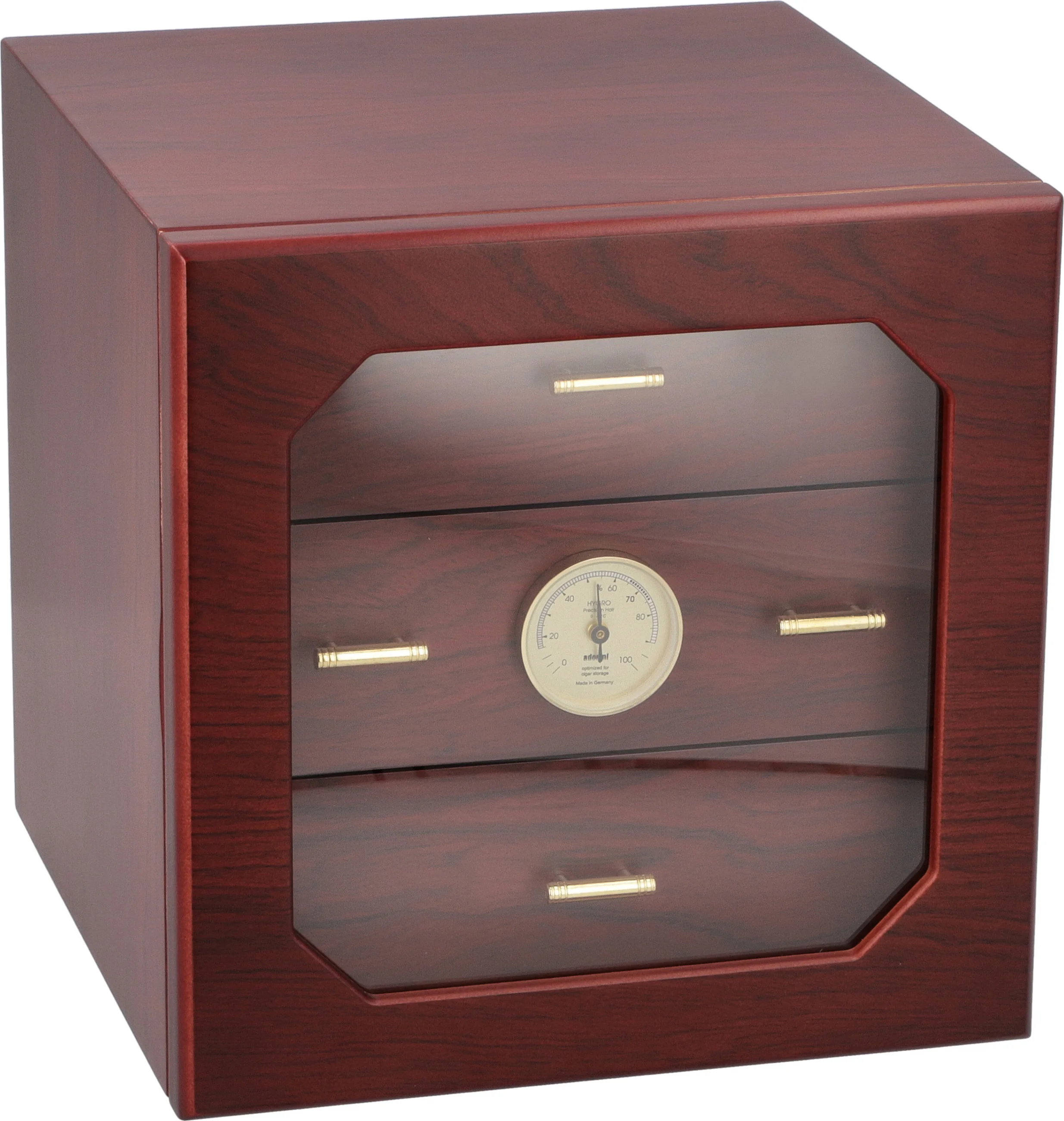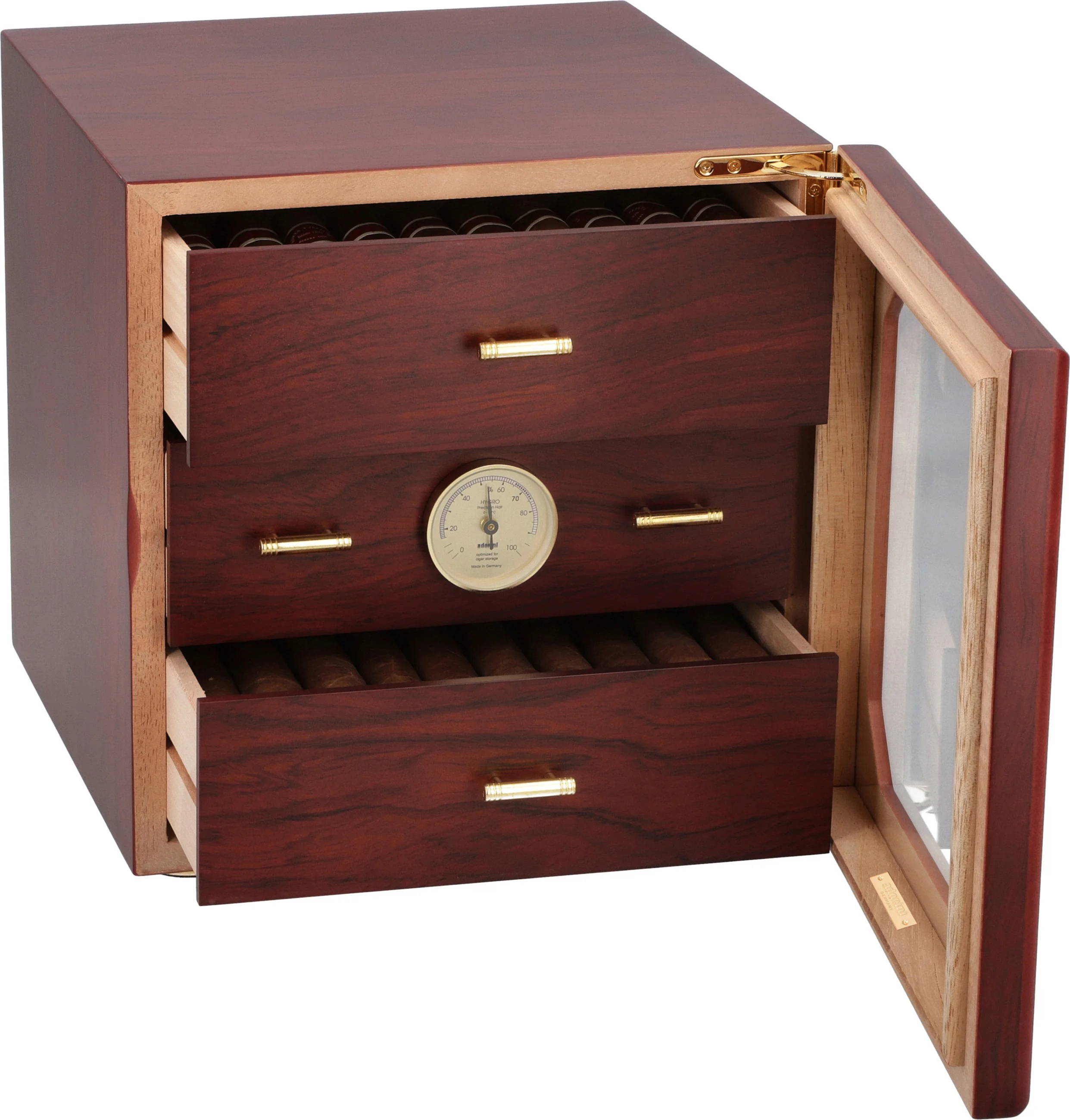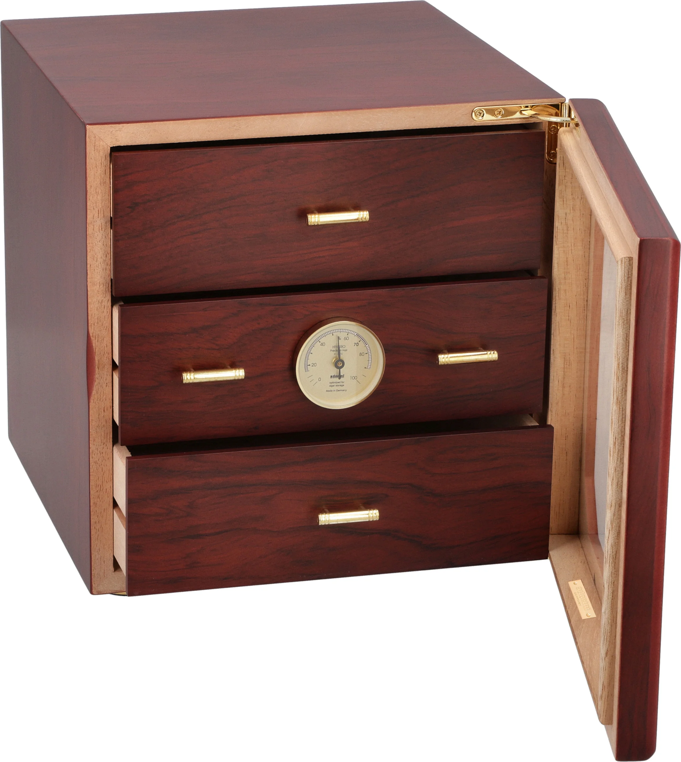 Der Humidor wird Bietet Platz für über 125 Standard-Zigarren in Corona-Größe, die durch den luxuriösen, vergoldeten Luftbefeuchter auf Acrylpolymerbasis von adorini in optimalem Zustand gehalten werden. Mithilfe einstellbarer Belüftungsöffnungen können Sie die Luftfeuchtigkeit an Ihre gewünschten Spezifikationen anpassen. An der Vorderseite der mittleren Schublade ist ein vorkalibriertes Präzisions-Haarhygrometer angebracht, mit dem Sie mit nur einem kurzen Blick die Luftfeuchtigkeit prüfen können, unabhängig davon, ob der Humidor geöffnet oder geschlossen ist.