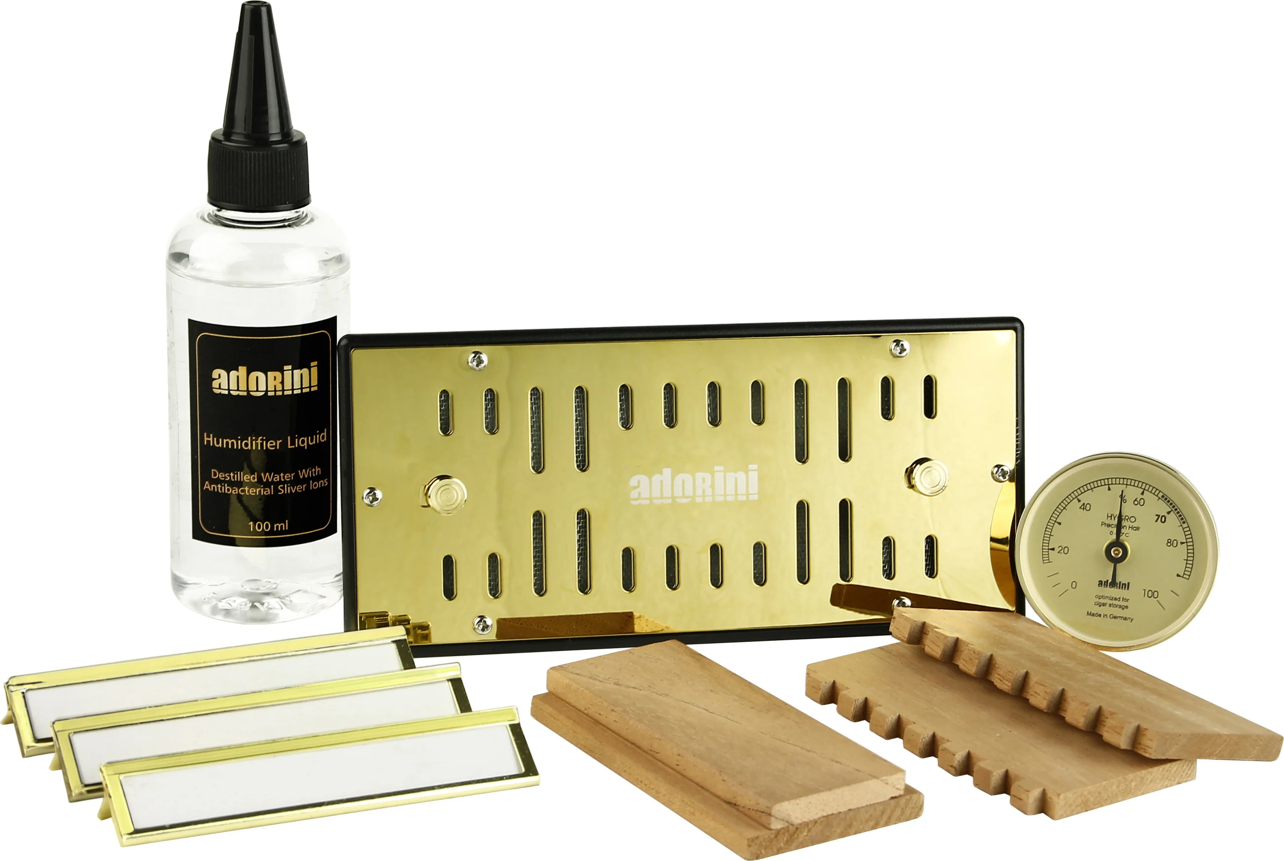 - Vergoldeter Adorini Deluxe Befeuchter, basierend auf Acryl Polymeren mit feinjustierbaren Öffnungsschlitzen zur optimalen Regulierung der Feuchtigkeit