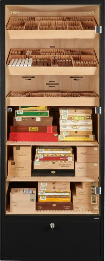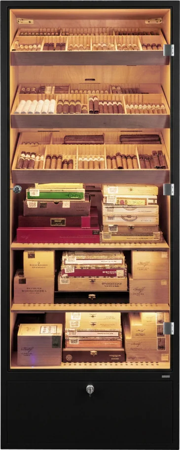 Mit seinem klassischen schwarzen Finish fügt er sich harmonisch in jede Umgebung ein. Verchromte Elemente wie Schloss und Scharniere setzen elegante Akzente und unterstreichen den hochwertigen Gesamteindruck, insbesondere wenn der Schrank mit Zigarren gefüllt ist.