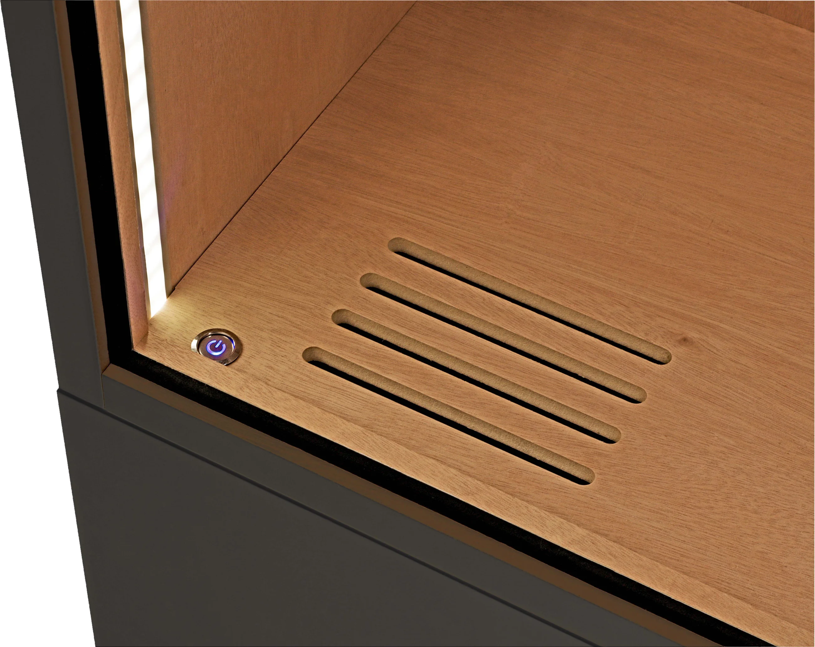 - L'intérieur de la cave à cigares est en placage de cèdre et dispose d'un second panneau arrière avec circulation d'air.