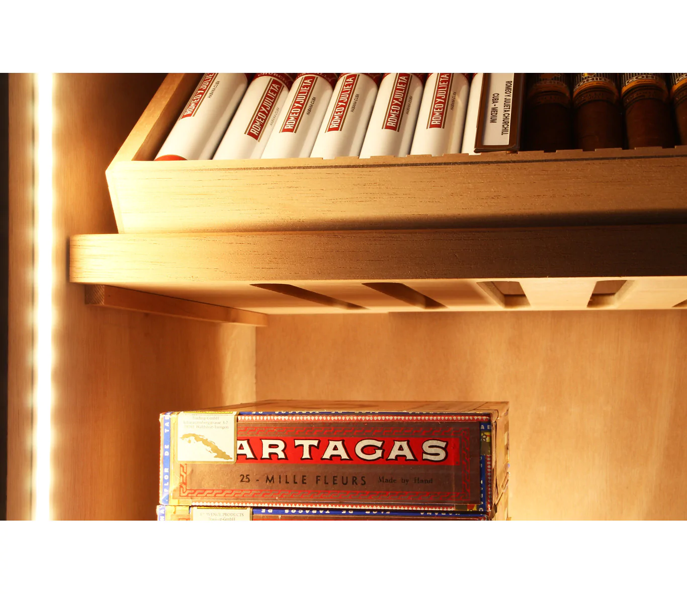 Nouveau concèpte modulaire de l'humidificateur. Flexibilité pour l'expansion. Au lieu d'avoir à payer pour de grandes caves sur mesure coûteuses, il est désormais possible de construire de grandes caves en attachant plusieurs caves Roma sous forme de modules les unes à côté des autres.