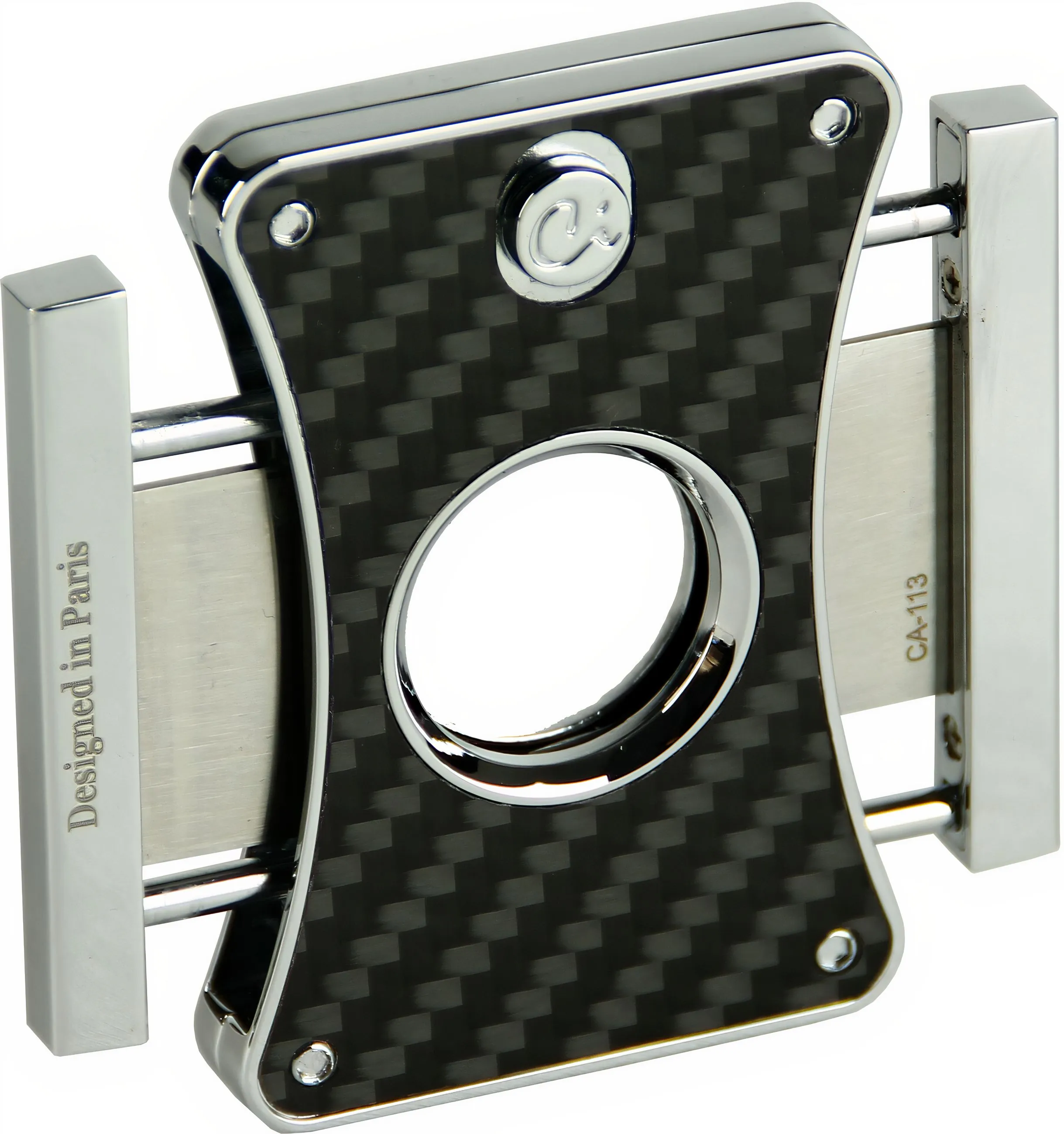 Le Caseti Carbon Cigar Cutter est un mélange parfait de design contemporain et de fonctionnalité élégante. Ce coupe-cigare à deux lames, combinant l'argent poli et le carbone moderne, est un accessoire exclusif de Caseti, pionnier dans le monde des accessoires pour cigares.