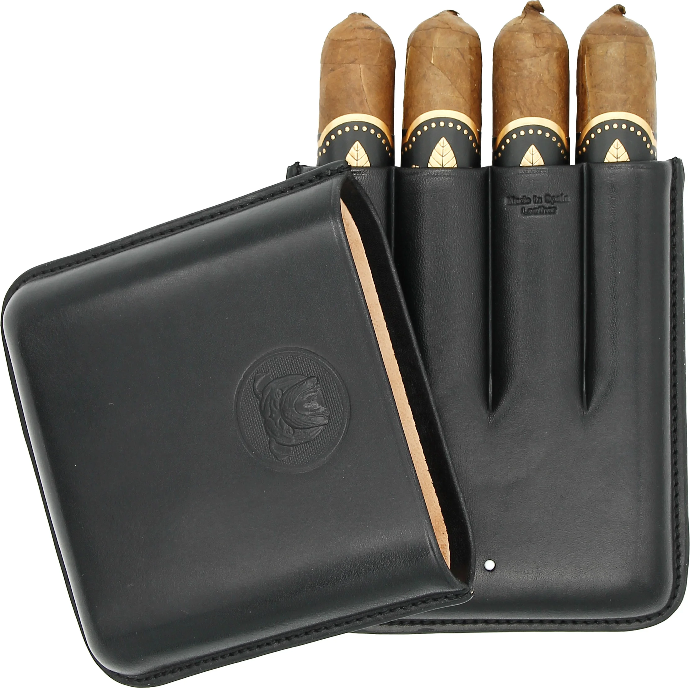 À l'intérieur, l'étui peut contenir quatre cigares de tailles différentes. Des encoches pratiques assurent une bonne tenue pendant le transport. L'intérieur est revêtu d'un cuir souple de couleur claire qui protège efficacement les cigares.