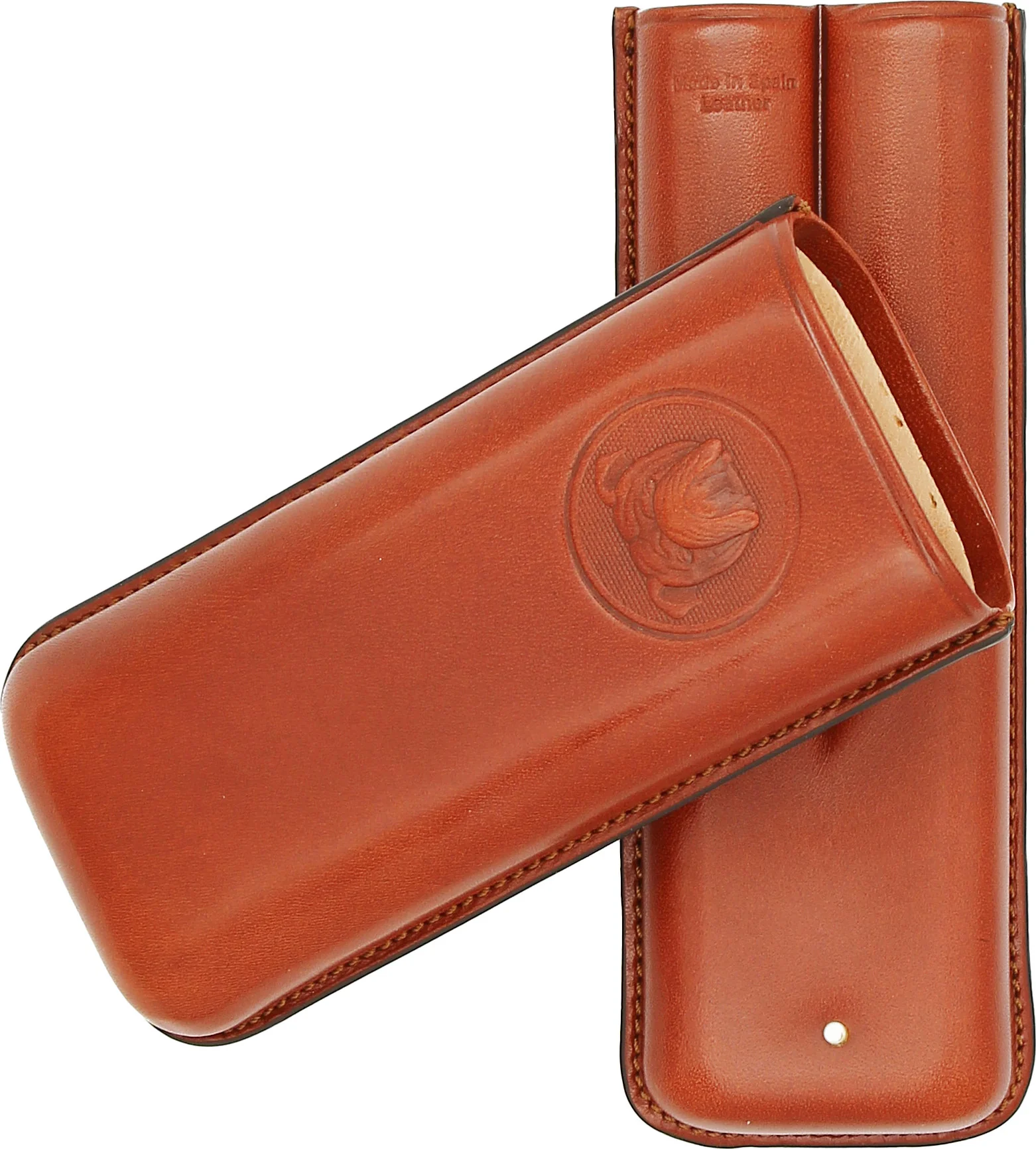 À l'intérieur, l'étui peut contenir deux cigares de tailles différentes. Des encoches pratiques assurent une bonne tenue pendant le transport. L'intérieur est revêtu de cuir souple de couleur claire et protège efficacement les cigares.