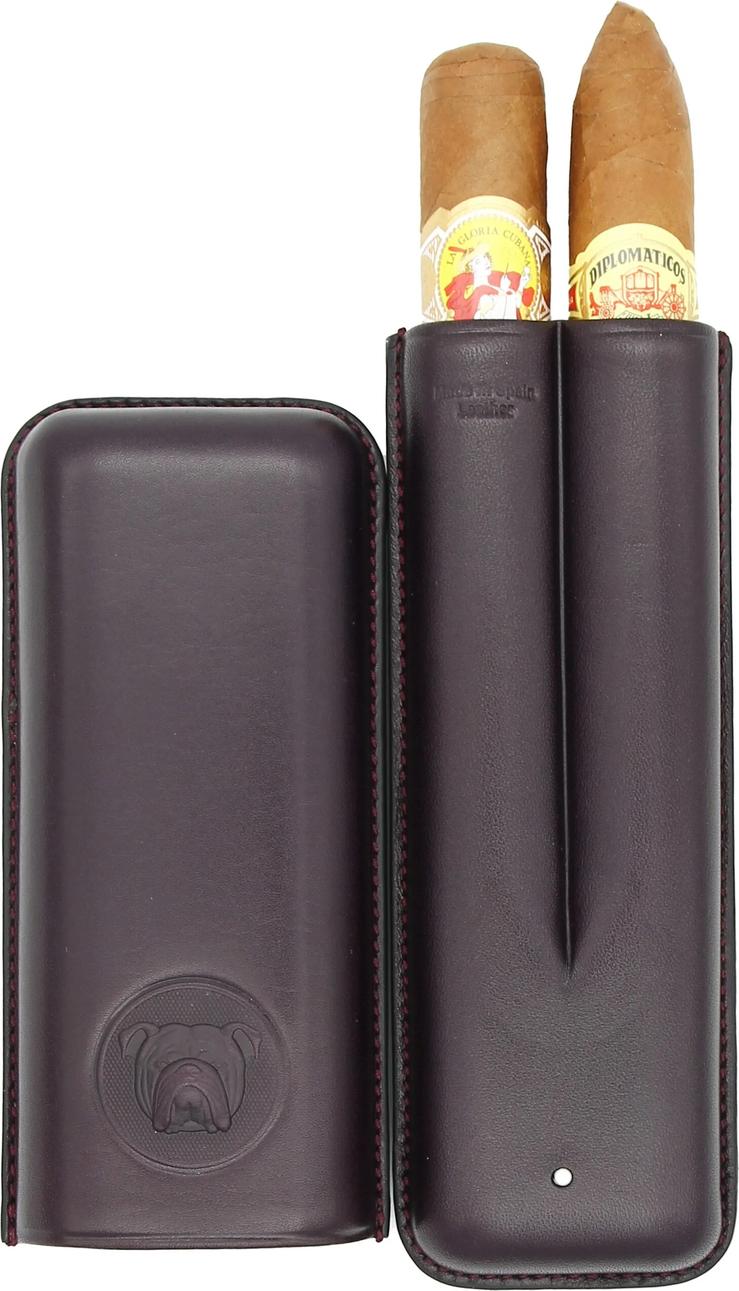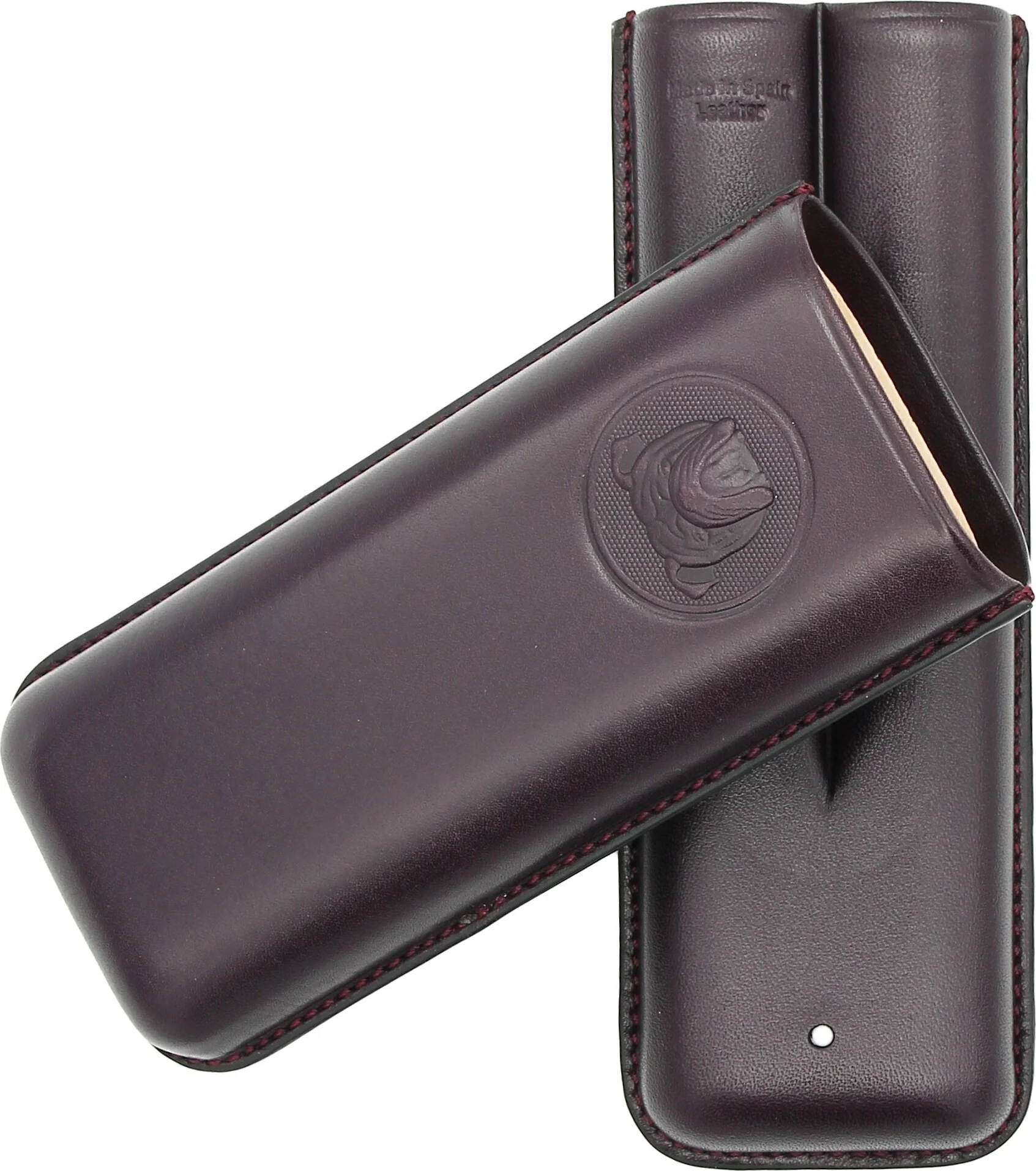 À l'intérieur, l'étui peut contenir deux cigares de tailles différentes. Des encoches pratiques assurent une bonne tenue pendant le transport. L'intérieur est revêtu d'un cuir souple de couleur claire qui protège efficacement les cigares.