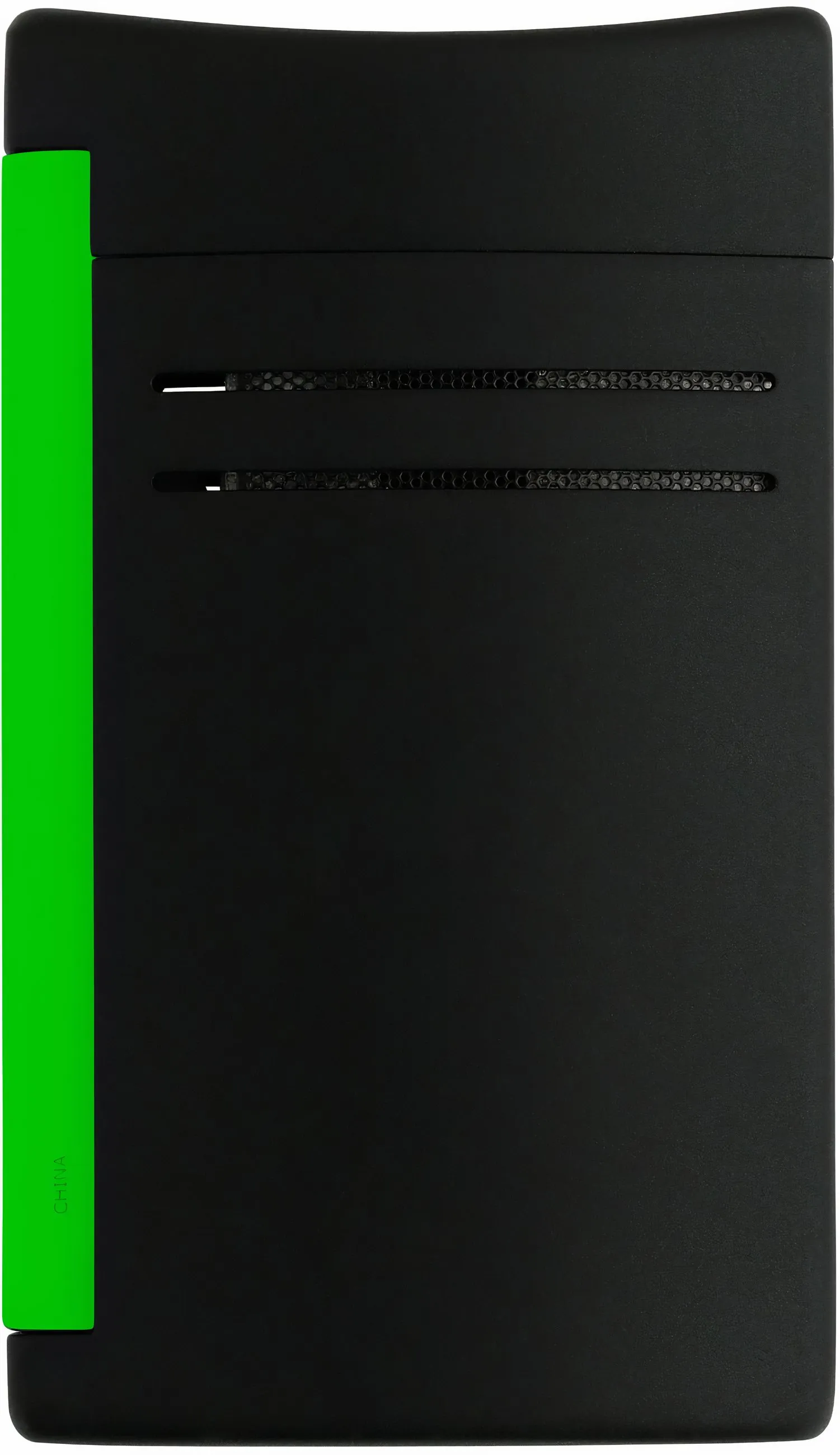 - Corps noir mat avec bouton vert vif.