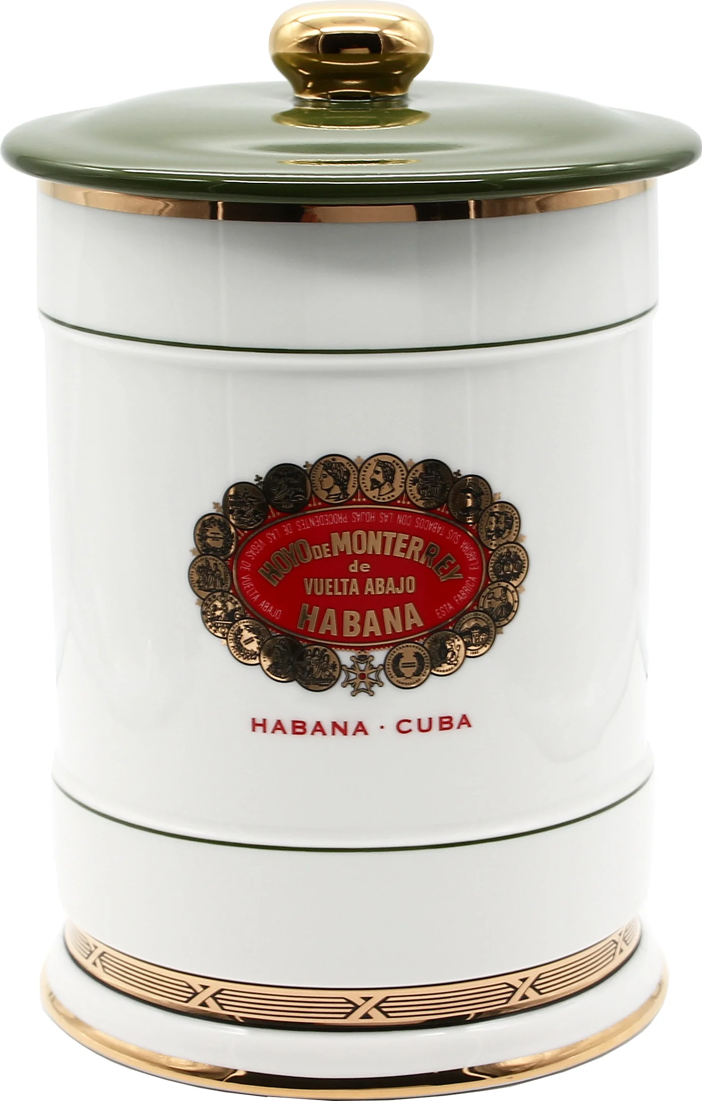 Das Hoyo de Monterrey Porzellanjar ist ein funktionales Aufbewahrungsgefäß für Zigarren der kubanischen Marke Hoyo de Monterrey. Es präsentiert sich in Weiß, Grün und goldenen Verzierungen, ergänzt durch das Hoyo de Monterrey Markenlogo auf der Front, das für die Wiedererkennbarkeit der Marke sorgt.
