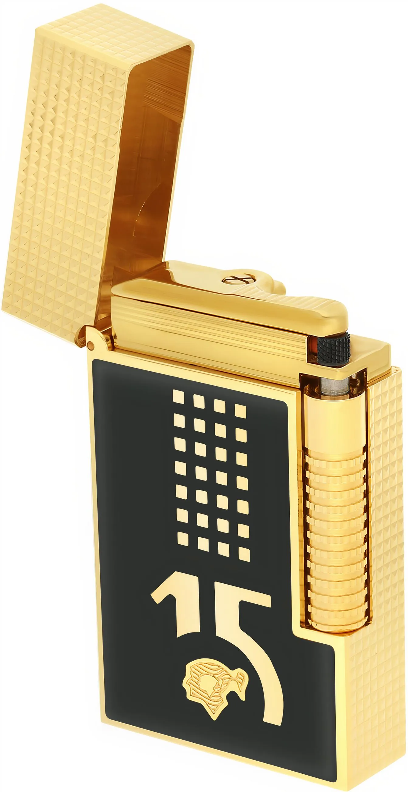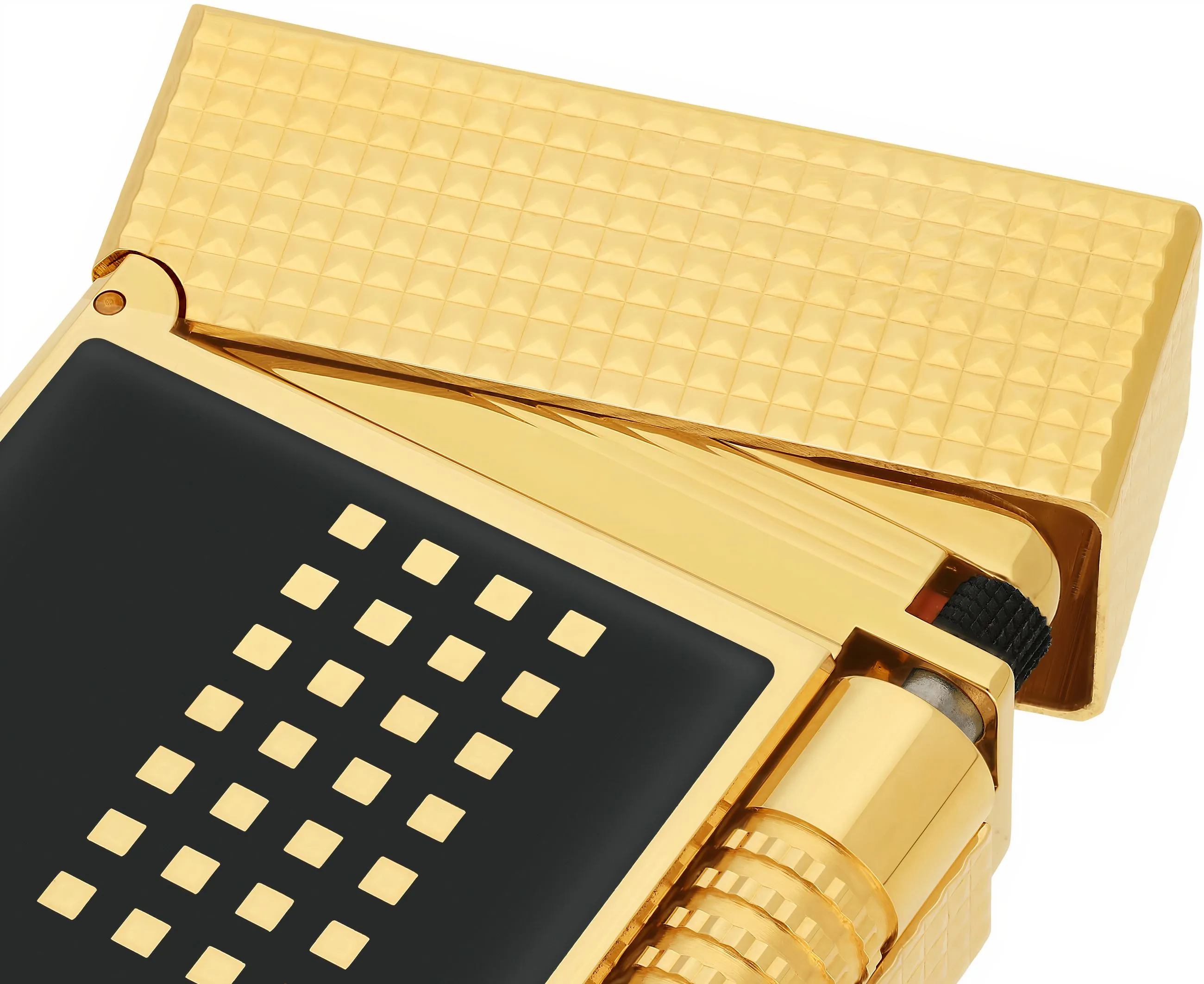 La combinazione di superficie nera opaca e accenti giallo-oro conferisce all'accendino un look sofisticato e moderno. È ricaricabile, l'altezza della fiamma è regolabile e l'accensione si basa su pietre focaie sostituibili.