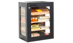 Una classica finitura laccata nera unisce una porta a vetri, i fianchi ed il piano per creare un elegante armadio che offre una facile visualizzazione e conservazionefino a 1500 sigari di dimensioni Corona.Una comoda maniglia della porta offre un'azione di apertura e chiusura agevole, mentre una serratura ed un set di chiavi evitano che i sigari vengano maneggiati in modo errato o che vengano presi senza autorizzazione. Quattro diversi livelli consentono molteplici configurazioni, incluso lo spazio per le scatole, mentre il sistema diilluminazione a LEDsfrutterà iltutto al meglio. Un vassoio in cedro Spagnolo con l'innovativo sistema di divisori adorini e le etichette con clip divisorie aggiungono versatilità al mobile, così come un pratico cassetto per accessori.