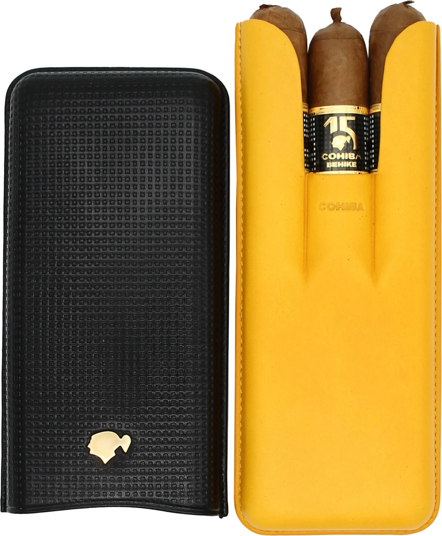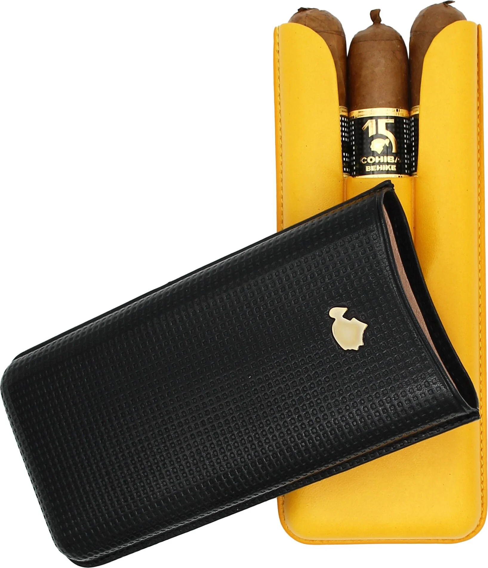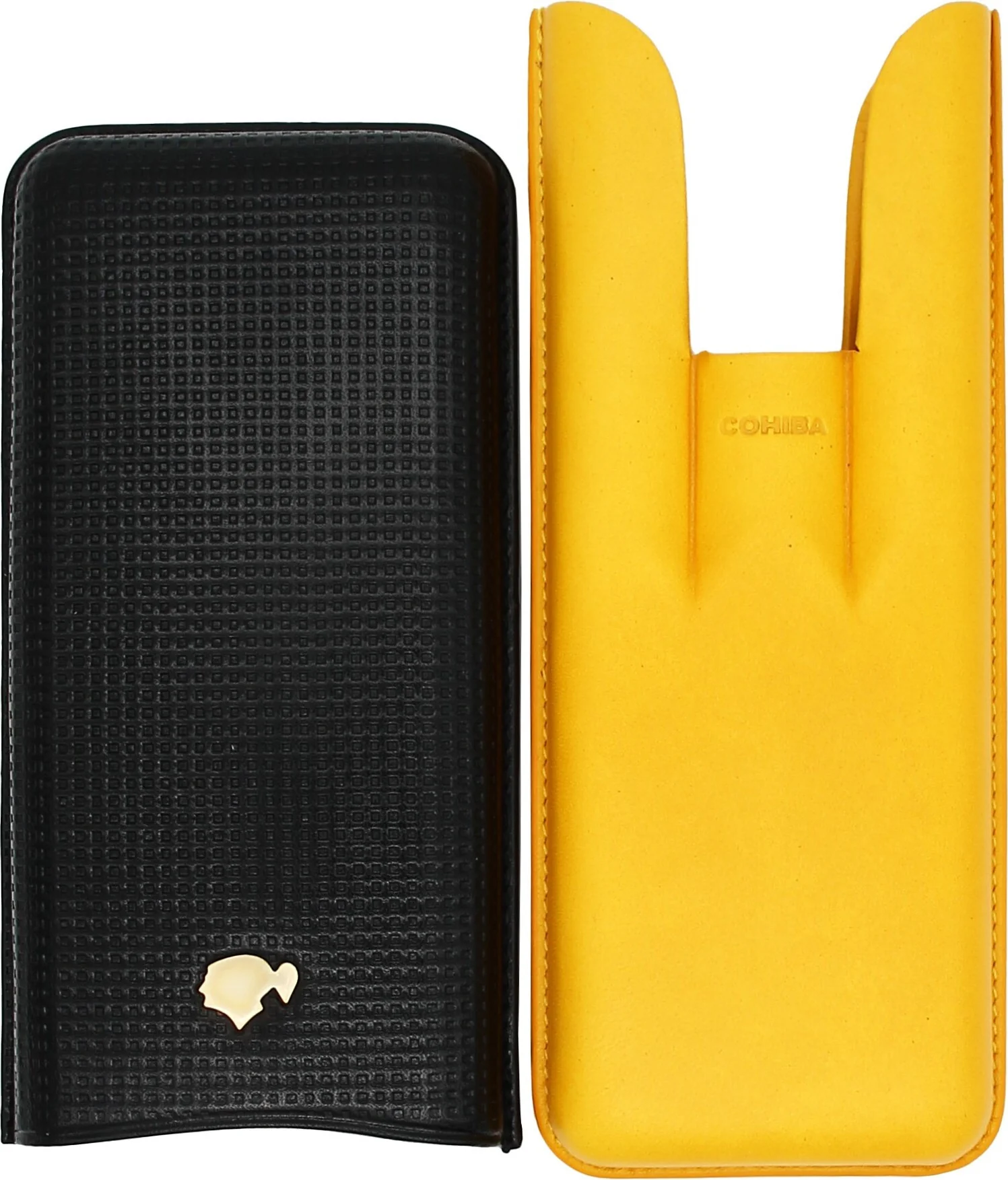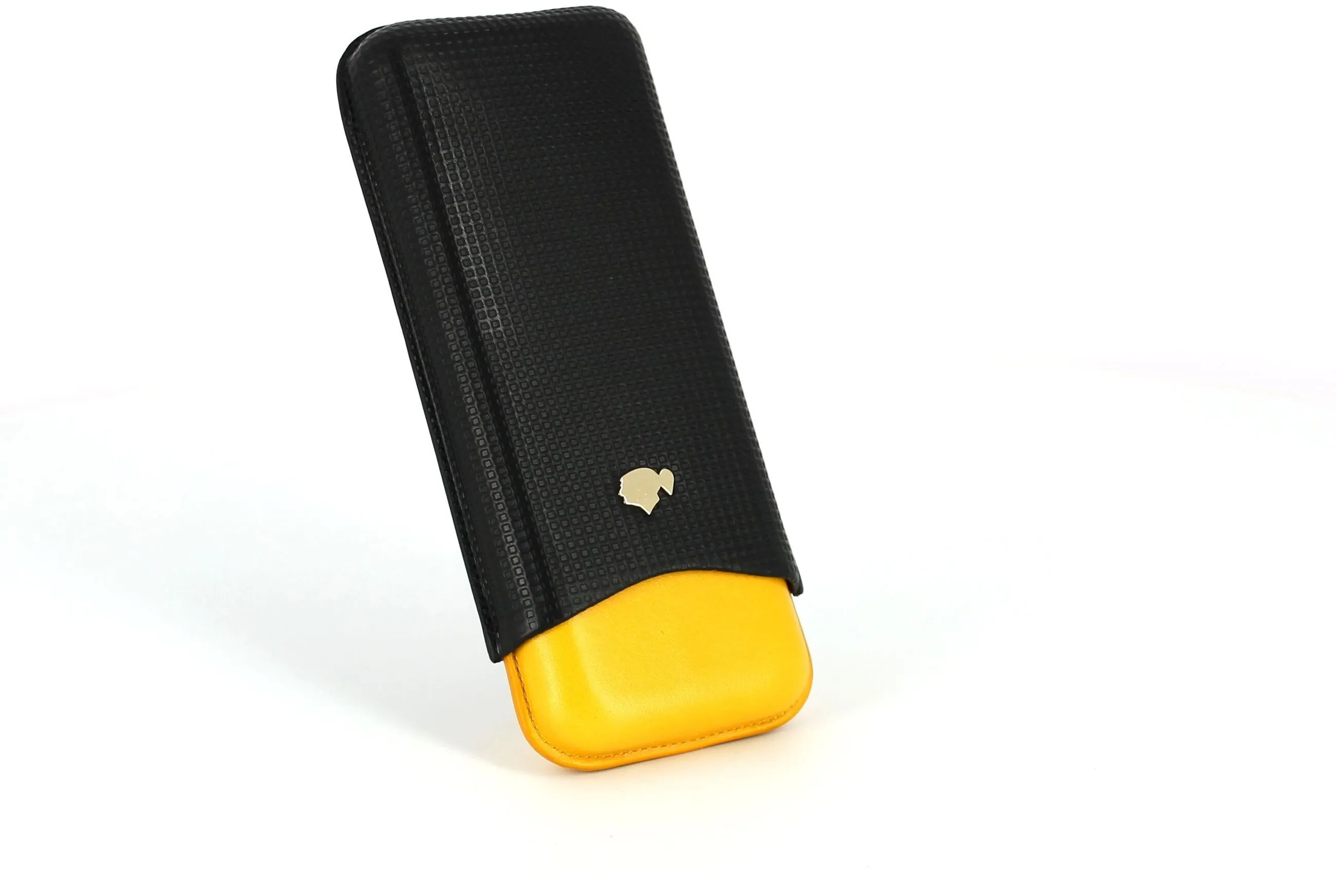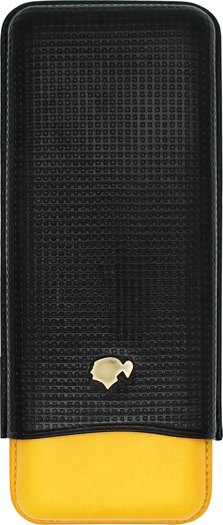 Il sorprendente portasigari in autentica pelle Spagnola cattura immediatamente l'attenzione con il suo bicolore giallo e nero, che gli esperti riconosceranno immediatamente come un omaggio alla famosa fascetta per sigari del marchio. La parte superiore nera della custodia è decorata con una griglia testurizzata, modellata sul familiare motivo quadrato della fascetta per sigari Cohiba. L'iconica sagoma Taino in argento di Cohiba lo rifinisce con un tocco di eleganza.