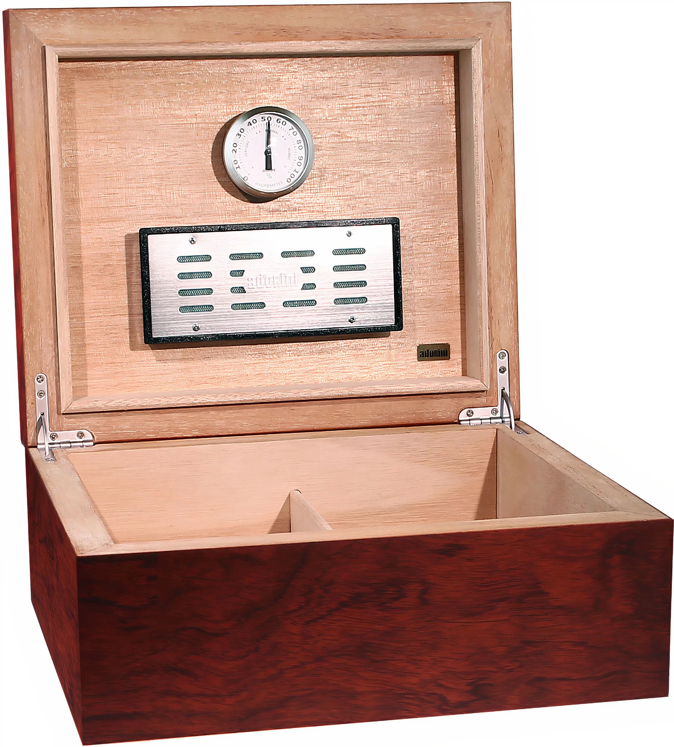 Questo humidor moderno e funzionale della serie Basic di adorini, di dimensioni M, colpisce per la sua finitura opaca, le sue belle venature e la sua versatilità. Con uno spazio per circa 75 sigari o scatole di sigari più piccole, offre una soluzione ideale per conservare i tuoi sigari in modo sicuro. È dotato di un igrometro analogico e di un umidificatore passivo a spugna. L'igrometro misura l'umidità grazie a una bobina metallica e, insieme all'umidificatore, è fissato magneticamente e in modo flessibile al coperchio dell'humidor. L'humidor è dotato di cerniere in argento opaco all'interno e di un labbro di tenuta particolarmente resistente che garantisce una ritenzione ottimale dell'umidità. Un divisorio verticale permette di compartimentare ulteriormente l'interno.