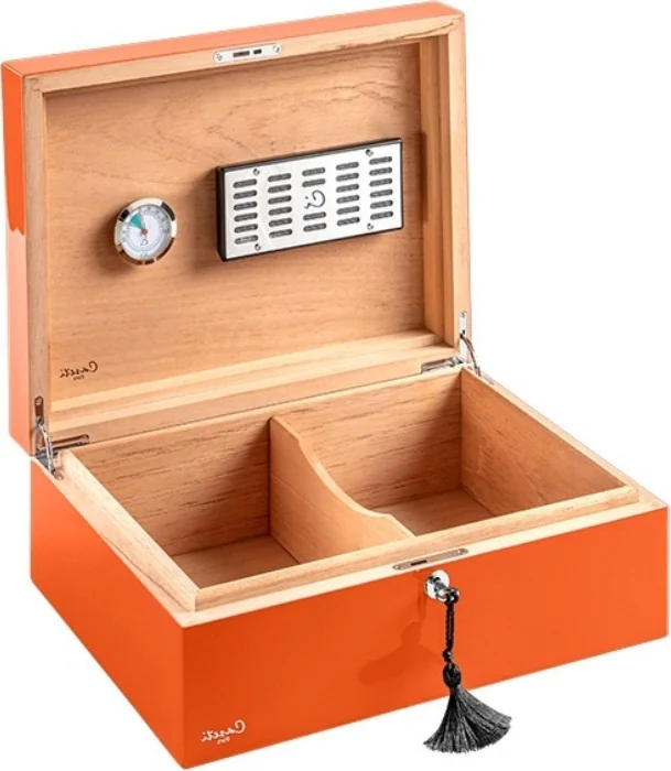 L'Humidor Caseti Paris Arancione è un sofisticato humidor del marchio francese Caseti che cattura immediatamente l'attenzione con la sua finitura lucida. La serie Paris è sinonimo di colori vivaci e si distingue nettamente dai classici humidor in legno impiallacciato che si vedono spesso.