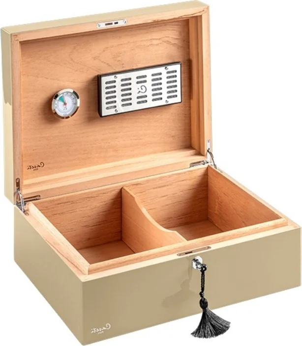 Il corpo dell'humidor è realizzato in MDF e impiallacciato in legno di cedro all'interno, il che contribuisce alla conservazione e all'invecchiamento ottimale dei tuoi sigari.