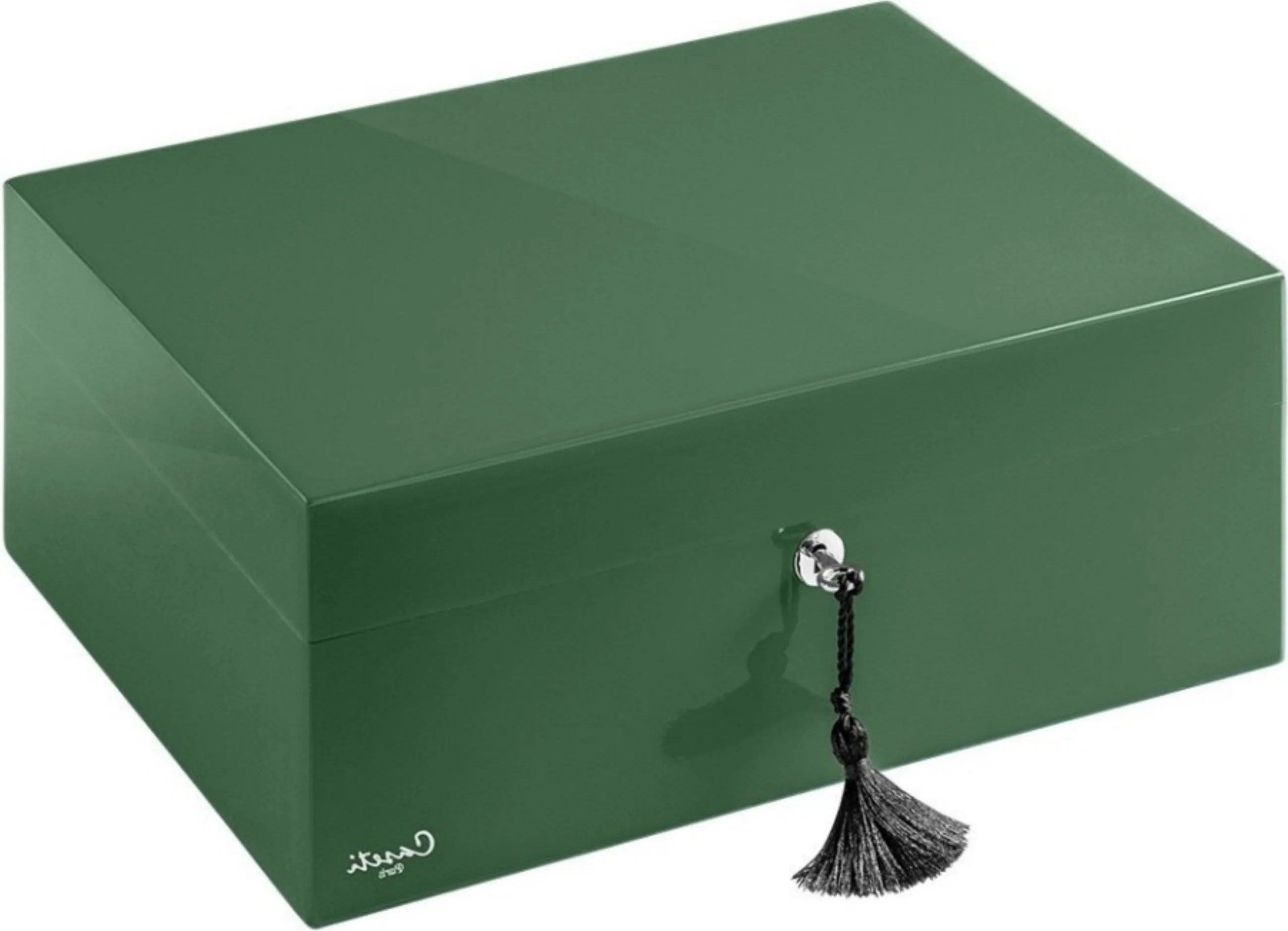 L'Humidor Caseti Paris Green è un sofisticato humidor del marchio francese Caseti che cattura immediatamente l'attenzione con la sua finitura lucida. La serie Paris è sinonimo di colori vivaci e si distingue nettamente dai classici humidor in legno impiallacciato che si vedono spesso.