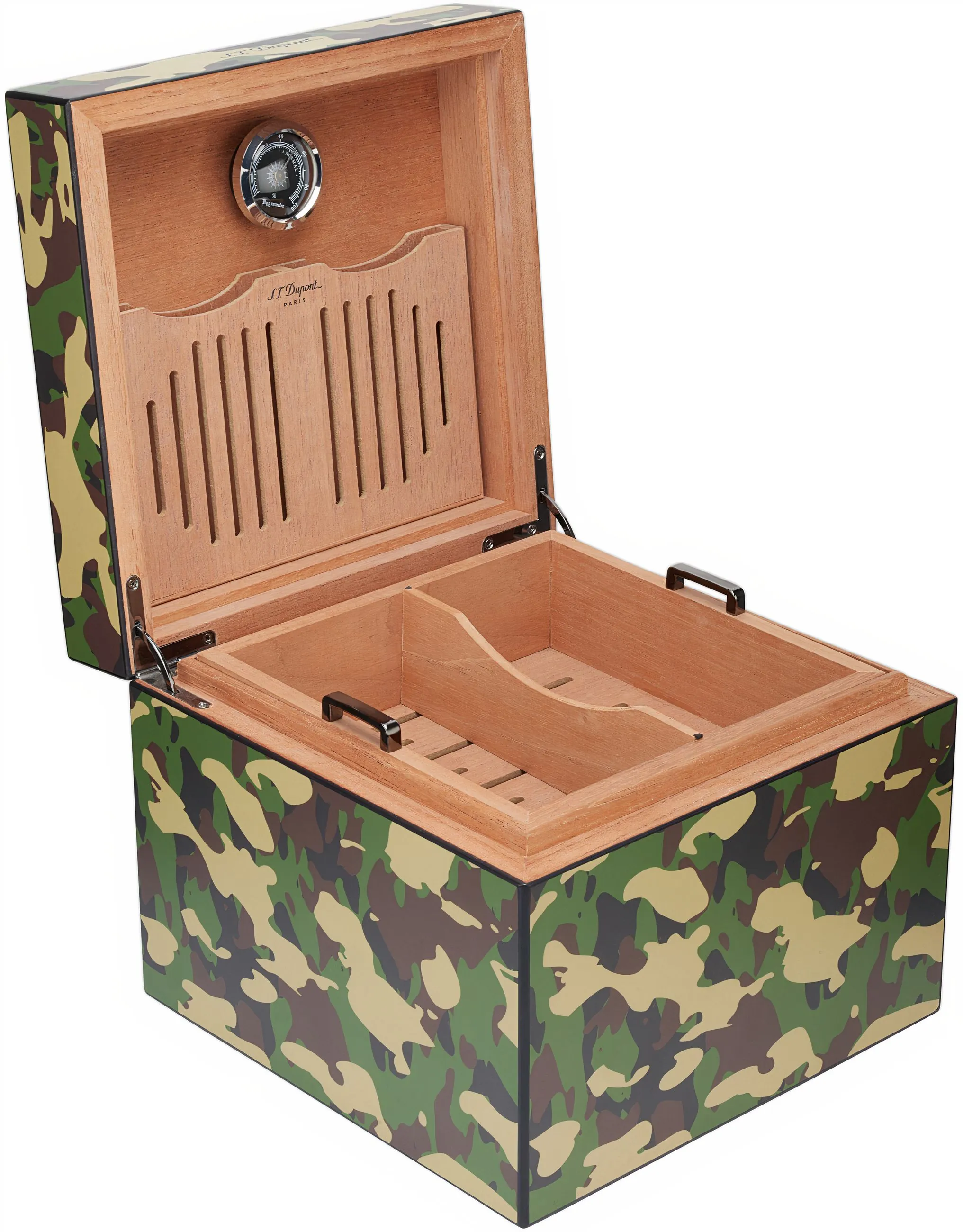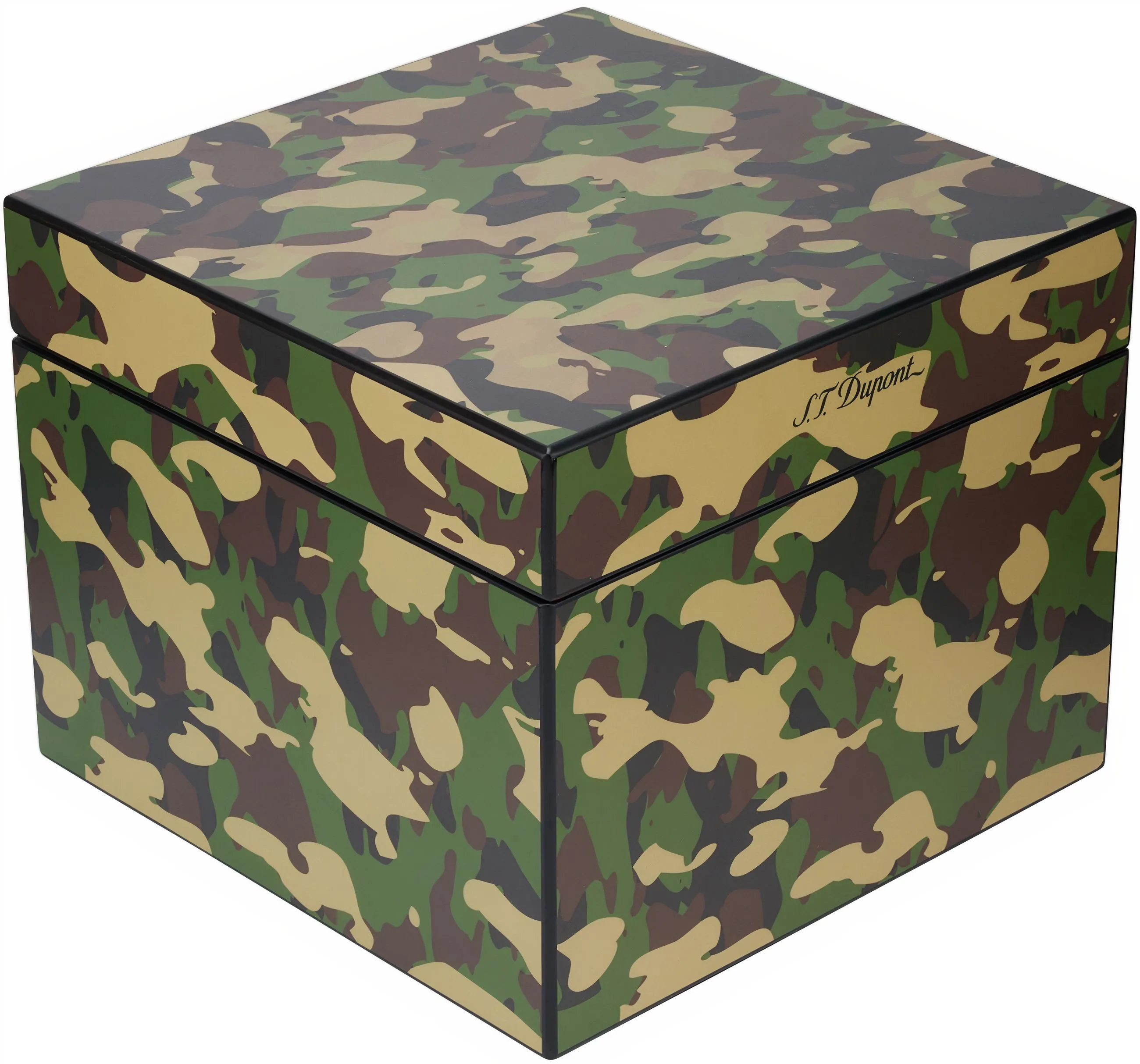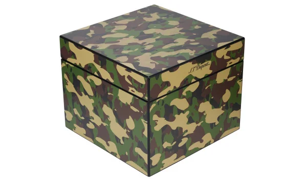 Design, materiali e funzioni:- Moderno humidor a cubo con un sorprendente motivo mimetico e la scritta S.T. Dupont sottilmente stampata sulla parte anteriore del coperchio.