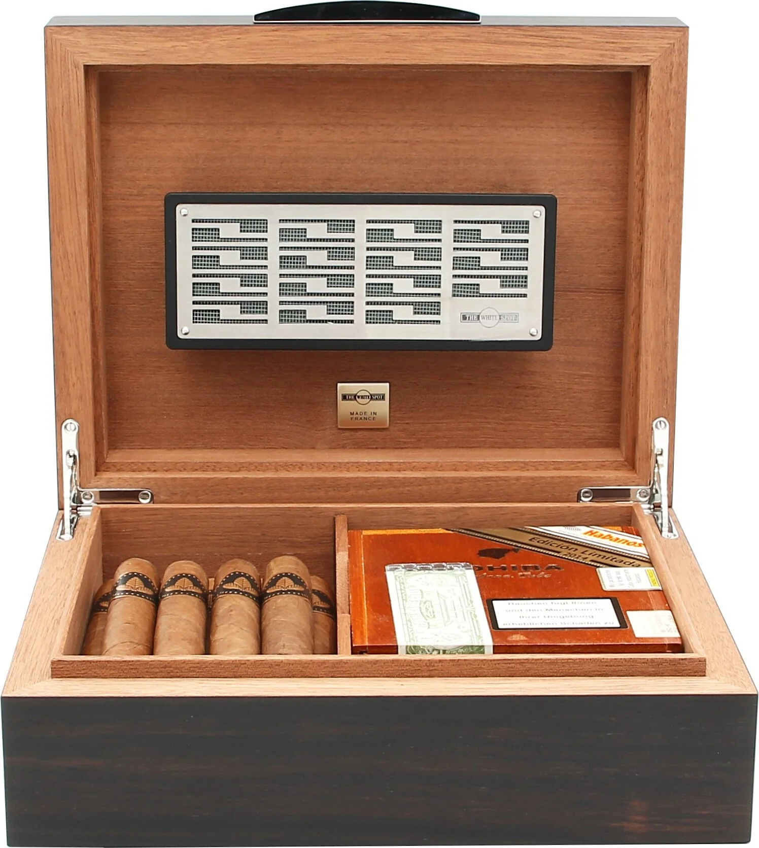 Con una capacità di circa 50 sigari, offre un ampio spazio per la tua collezione o anche per scatole di sigari più piccole. L'elegante manico in cromo lucido, con inciso il logo White Spot e il famoso punto bianco, sottolinea l'aspetto esteticamente armonioso dell'insieme e l'esclusiva identità del marchio. Già a prima vista è chiaro che si tratta di un prodotto di marca di alta qualità.