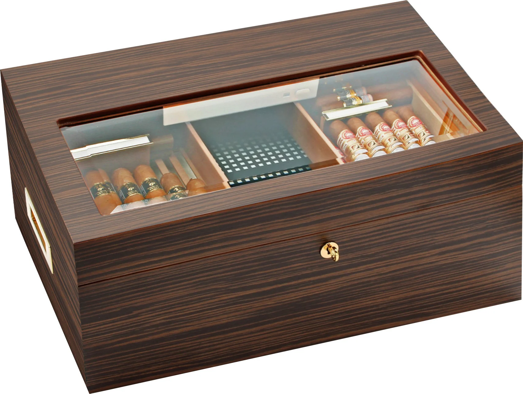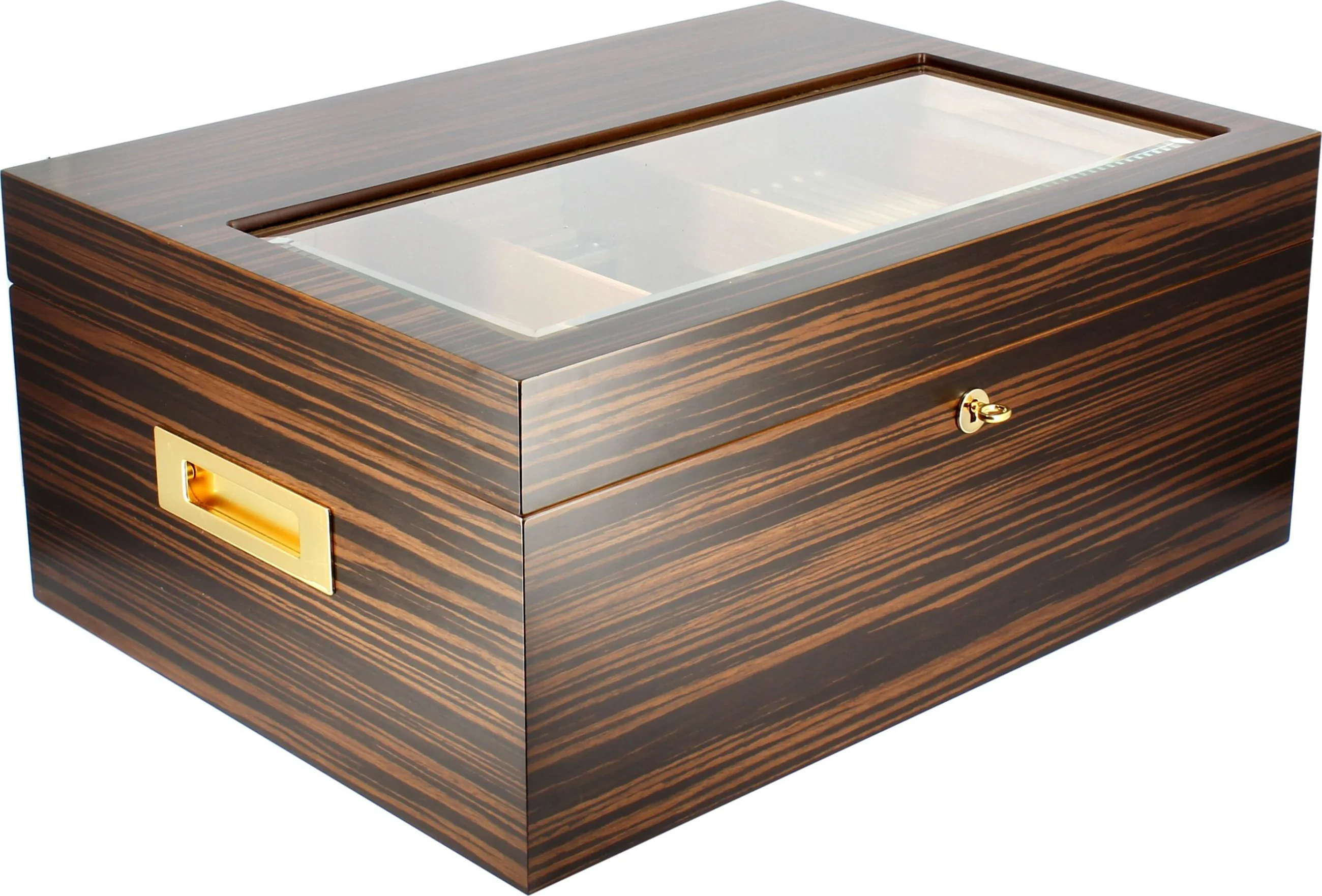 Con una impressionante capacità fino a 500 sigari di dimensioni Corona, l'humidor splendidamente realizzato presenta una finitura semi-lucida impiallacciata in ebano visivamente piacevole ed un coperchio con vetro di visualizzazione parziale. Cerniere a quadrante per impieghi gravosi e un corpo robusto danno all'humidor una solida base, e la serratura e le maniglie dorate forniscono maggiore sicurezza e facilità di mobilità. Cedro Spagnolo extra-spesso riveste l'interno per un ambiente ottimale per i sigari, che è ulteriormente migliorato dalle innovative nervature di ventilazione RibTech di adorini che aiutano a massimizzare il flusso d'aria in tutto l'humidor.