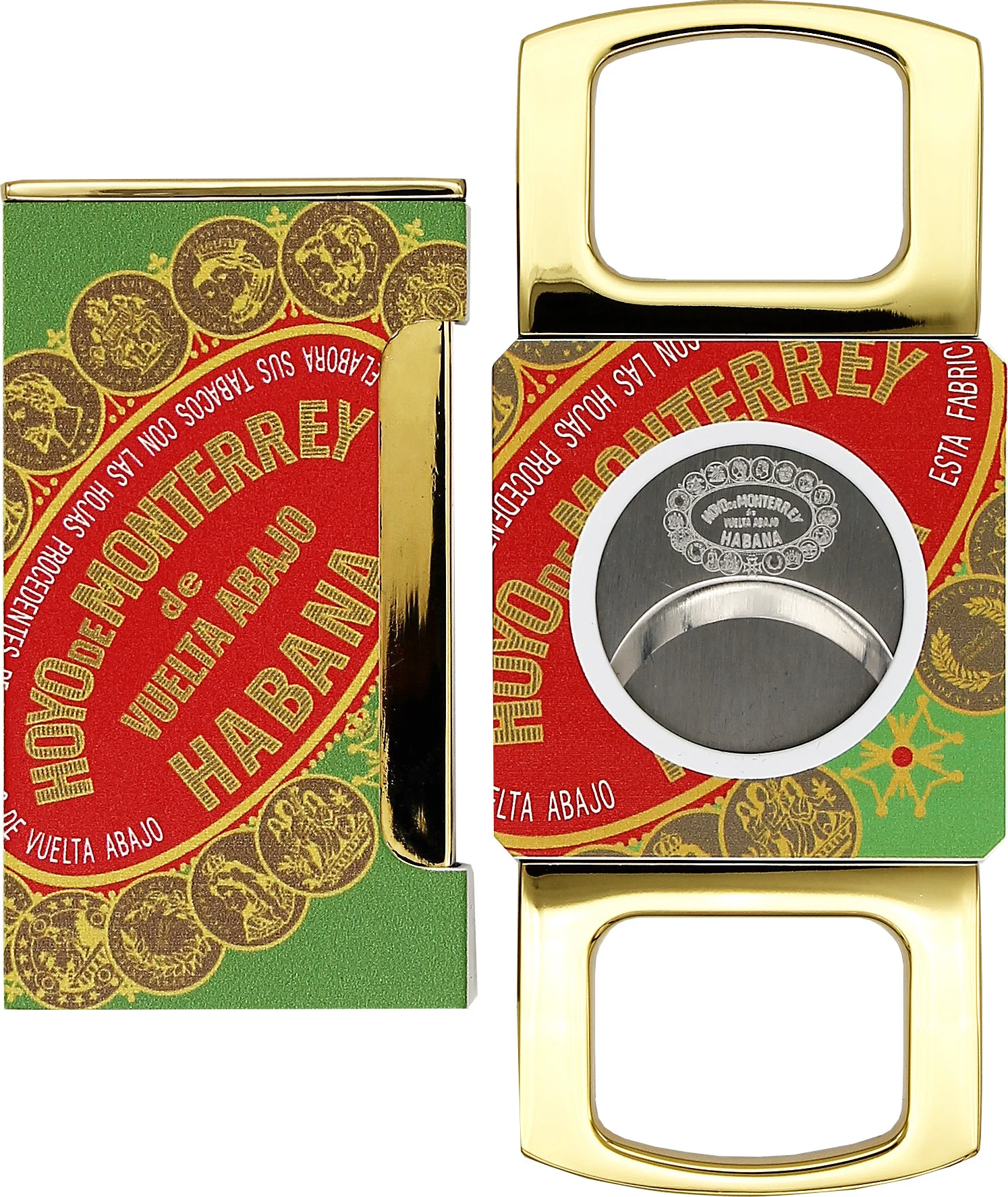 L'accendino è un accendino a getto a fiamma singola, ideale per accendere con precisione i sigari. È ricaricabile e l'intensità della fiamma può essere regolata individualmente utilizzando il controllo più/meno sulla base. Il tagliasigari a doppia lama è dotato di lame angolate in acciaio inossidabile che assicurano un taglio pulito e affidabile del sigaro. Una delle lame è inoltre incisa con il logo Hoyo de Monterrey, sottolineando ulteriormente l'impressione generale di alta qualità.