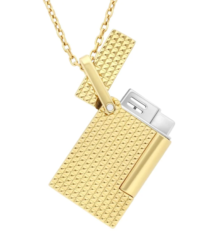 Ispirandosi alla cultura Hip-Hop, il marchio francese di lusso S.T. Dupont introduce sul mercato l'accendino su collana. Un accendino Dupont è sempre stato un pezzo forte, ma ora più che mai è possibile indossarlo come un pezzo da esposizione. Questo accendino piezoelettrico con fiamma morbida è disponibile in tre versioni. È piccolo e maneggevole, appeso a una collana lunga 90 cm. La lunghezza della catena è regolabile da 80 cm, 85 cm e 90 cm. L'accendino è ricaricabile e viene fornito vuoto; una bombola di gas deve essere acquistata separatamente. Con questa innovativa collana non perderai più il tuo accendino.