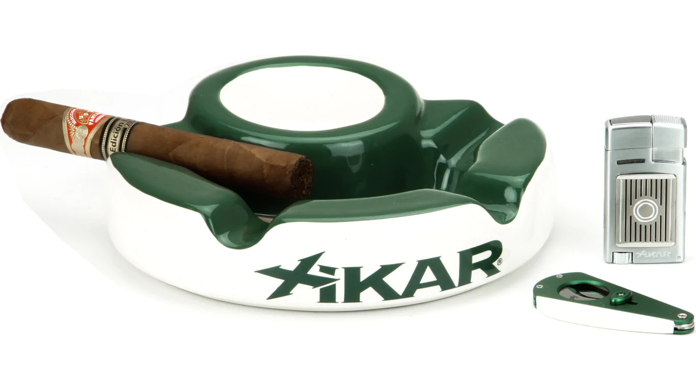 Ammantati di un bellissimo verde e bianco , questi accessori sono tutto ciò di cui gli appassionati di sigari hanno bisogno per rilassarsi dopo una giornata trascorsa sui links. Il leggendario Tagliasigari Xi di Xikar e le sue potenti lame in acciaio inossidabile offrono un taglio perfetto con una semplice pressione delle impugnature. Il pluripremiato accendino Forte di Xikar con un intarsio decorativo modellato sulla forma di una mazza in ferro offre una forte fiamma resistente al vento, ideale per il percorso. Un posacenere in ceramica "buca in uno" è dotato di una profonda ciotola "trappola di sabbia" con supporti per quattro sigari ed una tazza stilizzata, che lo rende un perfetto porta accessori.