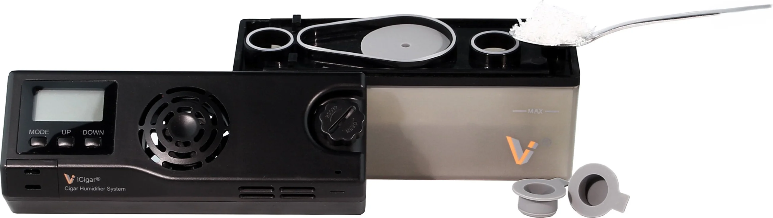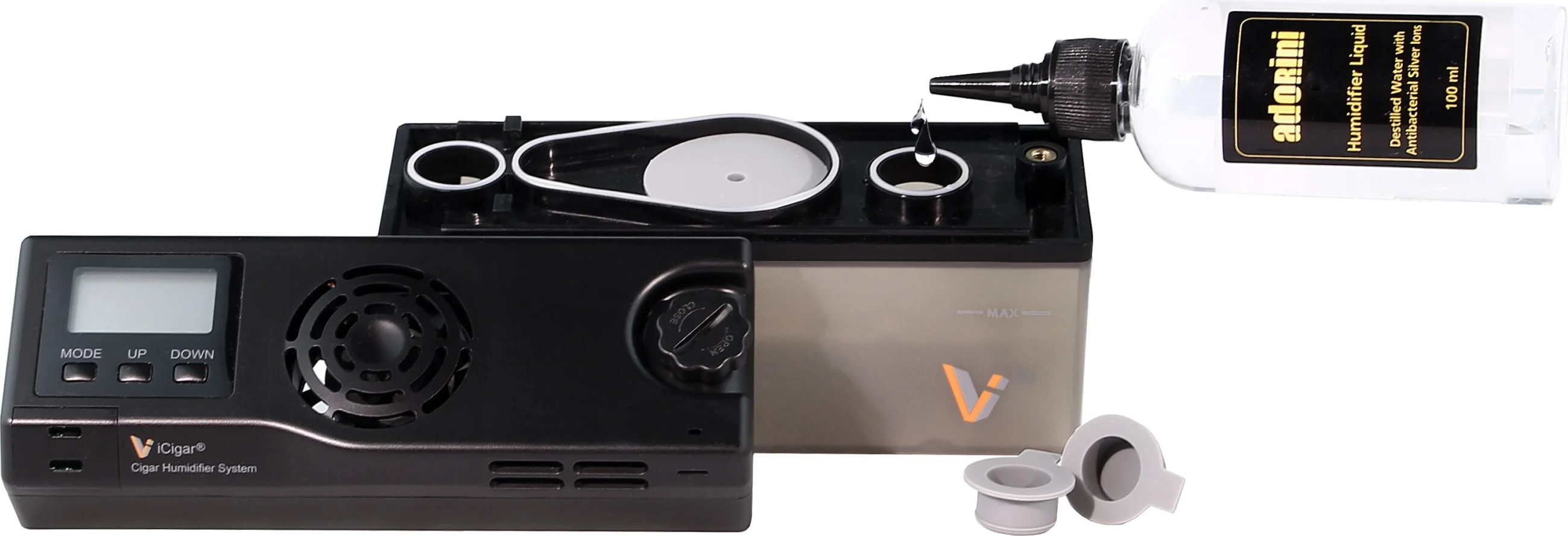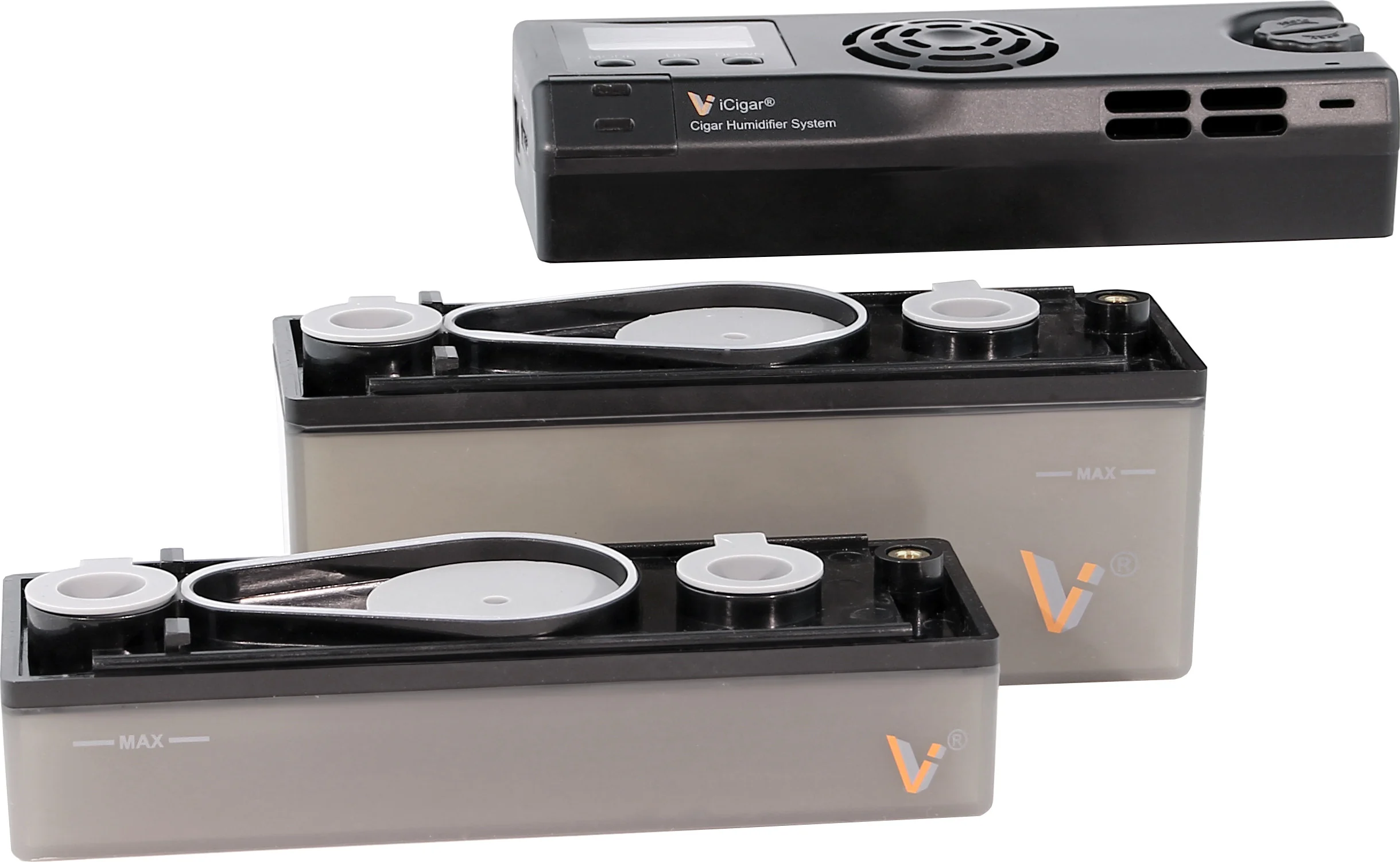 Der elektronische Befeuchter LV besticht durch ein modernes Design mit einer transparenten nachfüllbaren Kartusche, die mit Acrylpolymerkristallen gefüllt ist, die mit destilliertem Wasser ein feuchtigkeitsspendendes Gel bilden. Dadurch ist die Zugabe spezieller Flüssigkeiten überflüssig. Dank seiner praktischen Größe passt dieses Gerät in eine Vielzahl von Humidoren. Es ist für kleine bis mittelgroße Zigarrensammlungen von 50 bis 600 Zigarren konzipiert und kann mit einem optionalen Lüfter für eine verbesserte Luftzirkulation auch für größere Humidoren aufgerüstet werden.