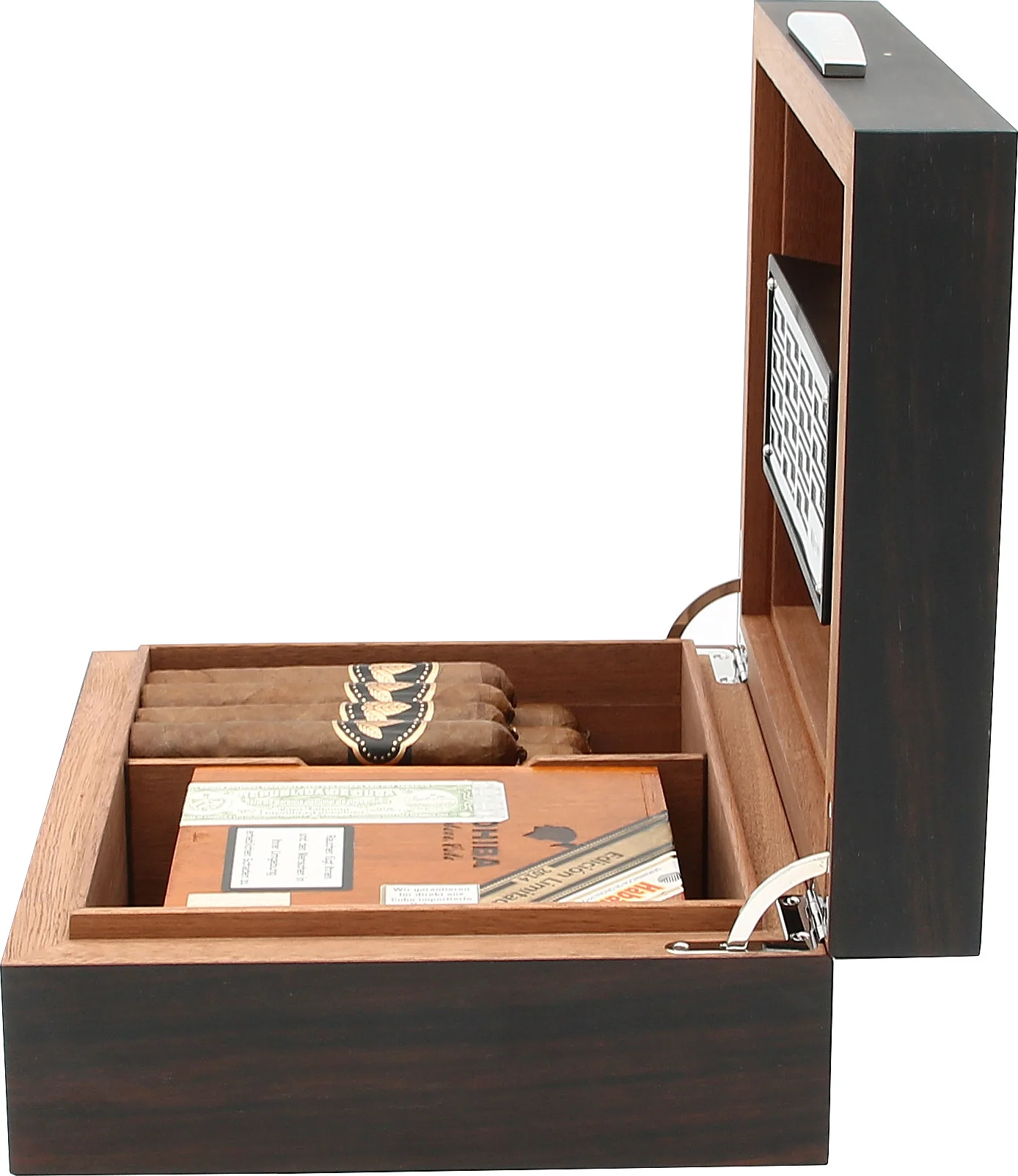 Zum Lieferumfang gehören ein passiver Befeuchter sowie ein vertikaler Divider zur Unterteilung des Innenraums. Der Befeuchter wird magnetisch an der dafür vorgesehenen Metallplatte im Deckel befestigt.