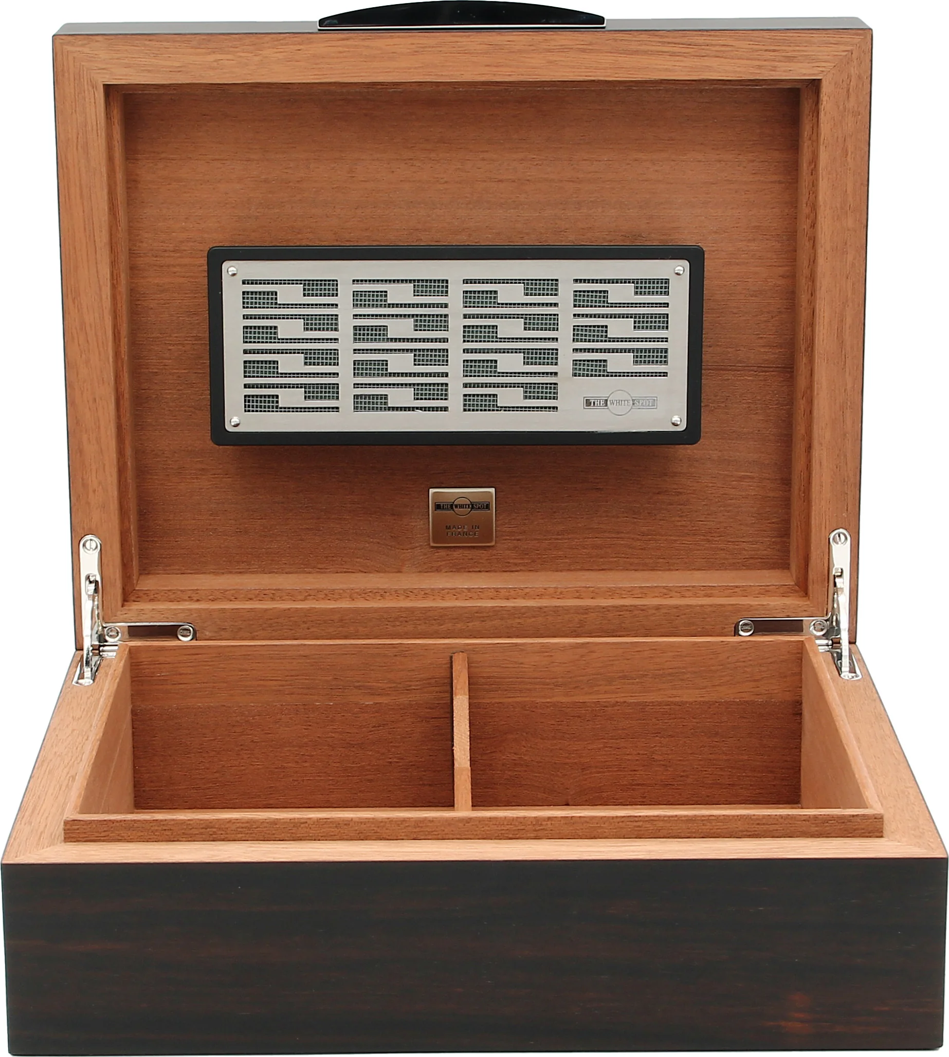 Mit einem Fassungsvermögen von etwa 50 Zigarren bietet er ausreichend Platz für Ihre Sammlung oder auch kleinere Zigarrenkisten. Der edle Griff aus glänzendem Chrom, graviert mit dem White Spot-Schriftzug und dem berühmten weißen Punkt, unterstreicht das ästhetisch harmonische Gesamtbild und die exklusive Markenidentität. Schon auf den ersten Blick wird klar, dass es sich hierbei um ein hochwertiges Markenprodukt handelt.
